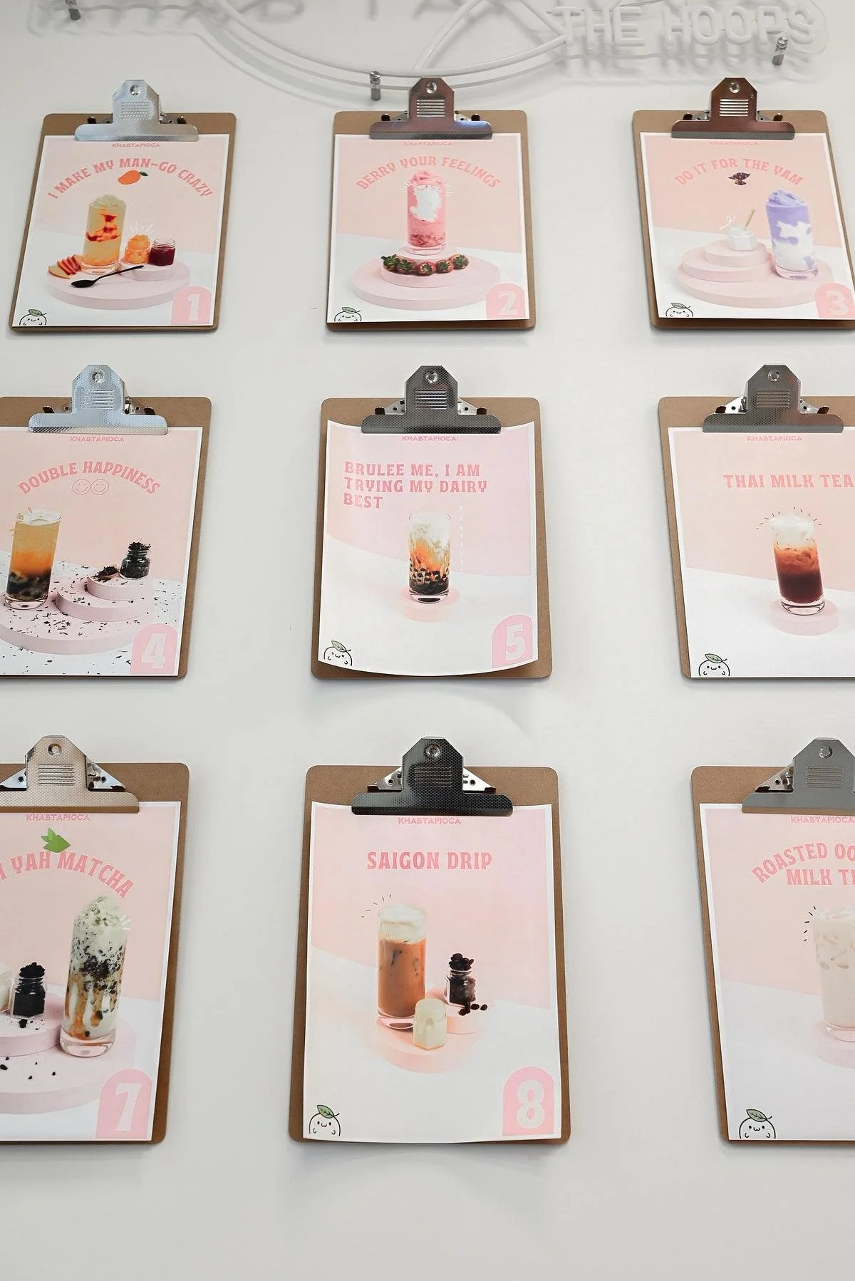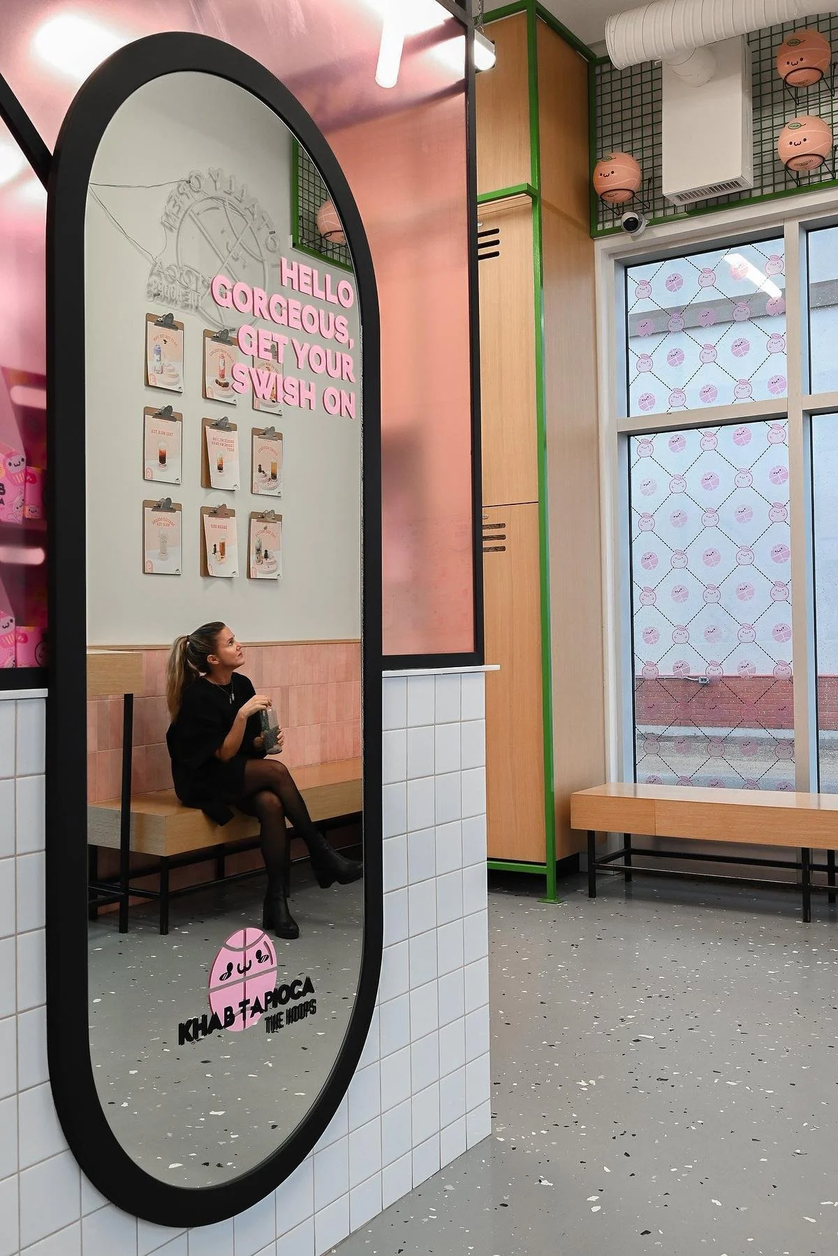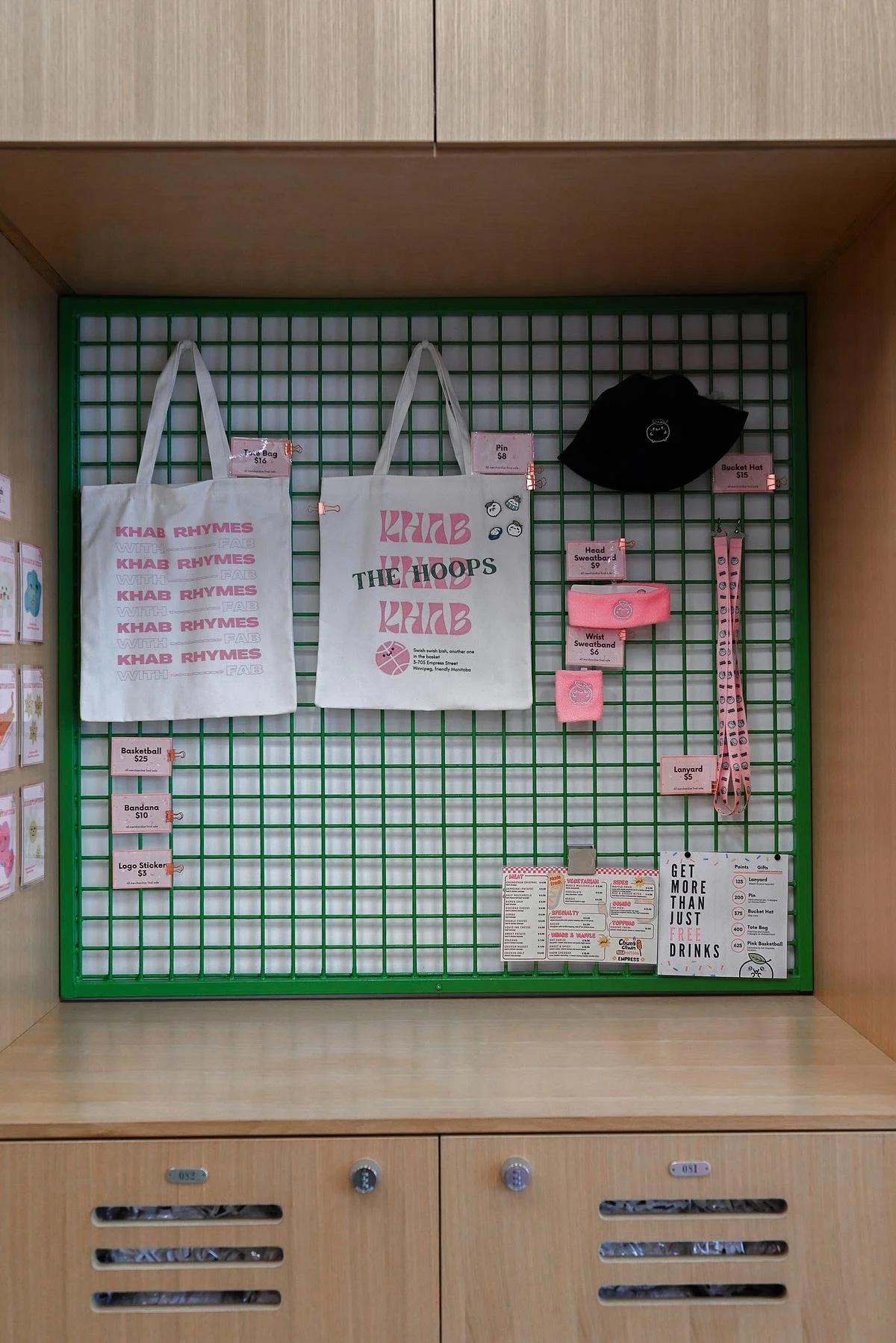 Brand expression extends through every surface, from mirror signage flashing “Hello Gorgeous, Get Your Swish On” to the clipboard menus mounted like a coach’s playbook. Each drink is presented with tongue-in-cheek names such as Brulee Me, I’m Trying My Dairy Best and Saigon Drip, reinforcing the playful tone that defines the KHAB Tapioca experience. Even the merchandise corner, complete with tote bags, pins, and pastel headbands, follows the locker-room aesthetic with its gridlined green wire mesh that nods to basketball nets.