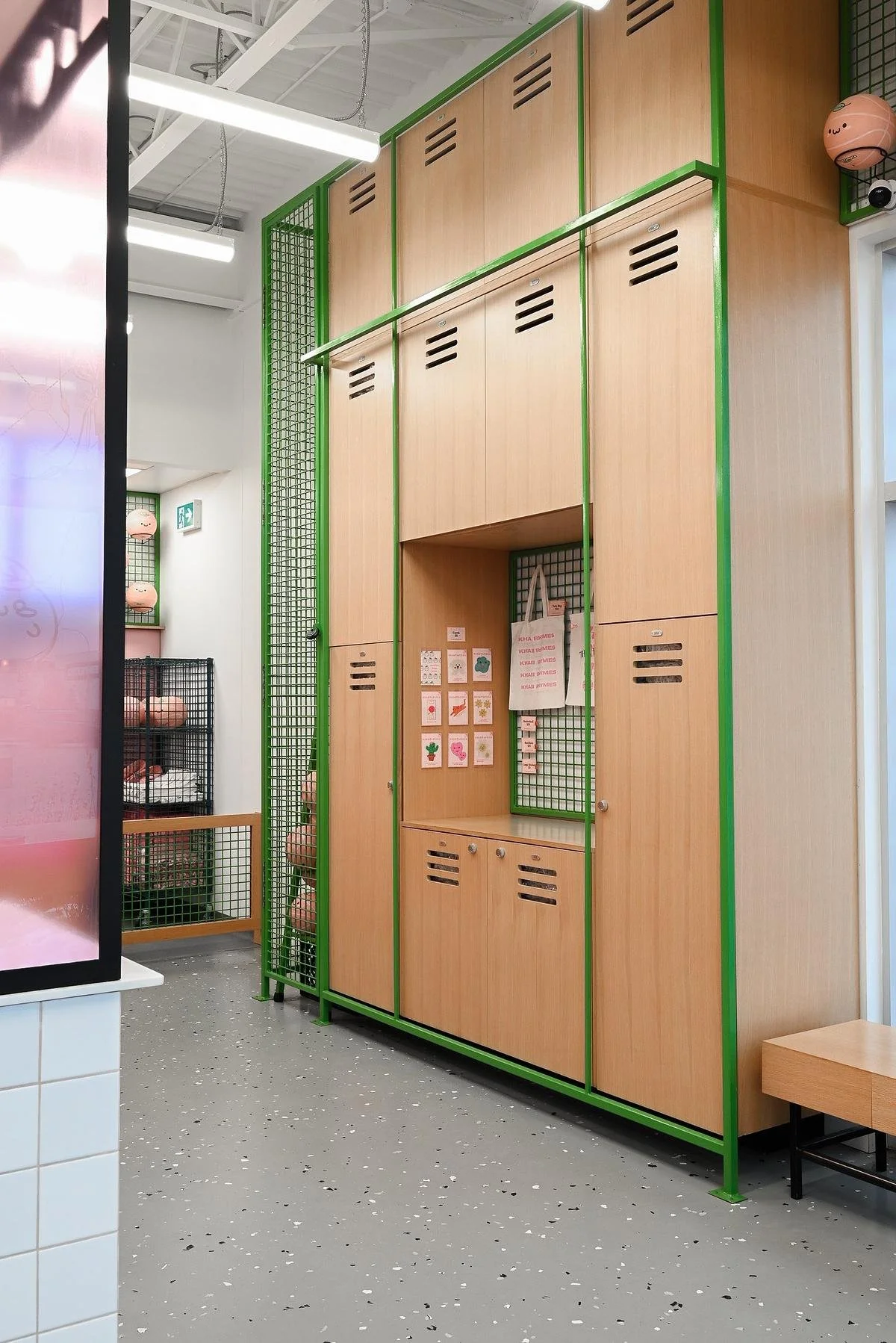 Floor-to-ceiling lockers line one side of the shop, evoking the nostalgic intimacy of a gym’s changing room while doubling as functional storage and display. Each unit comes complete with venting slats, numbering, and locks, lending authenticity to the athletic concept. The designers even included a custom ladder to reach upper compartments, while a cage of kawaii-faced basketballs hovers playfully above, serving as both merchandise and décor.