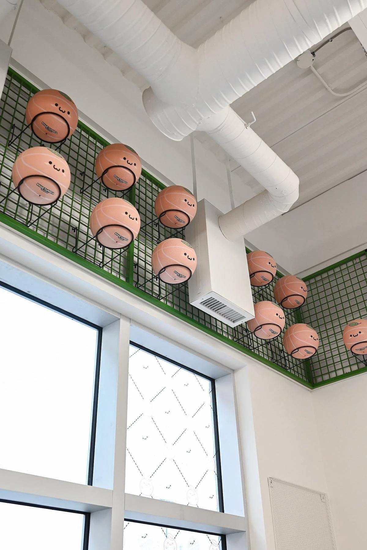 Kawaii-faced basketballs perch on green grid racks above, merging sport and cuteness into a playful overhead display.
