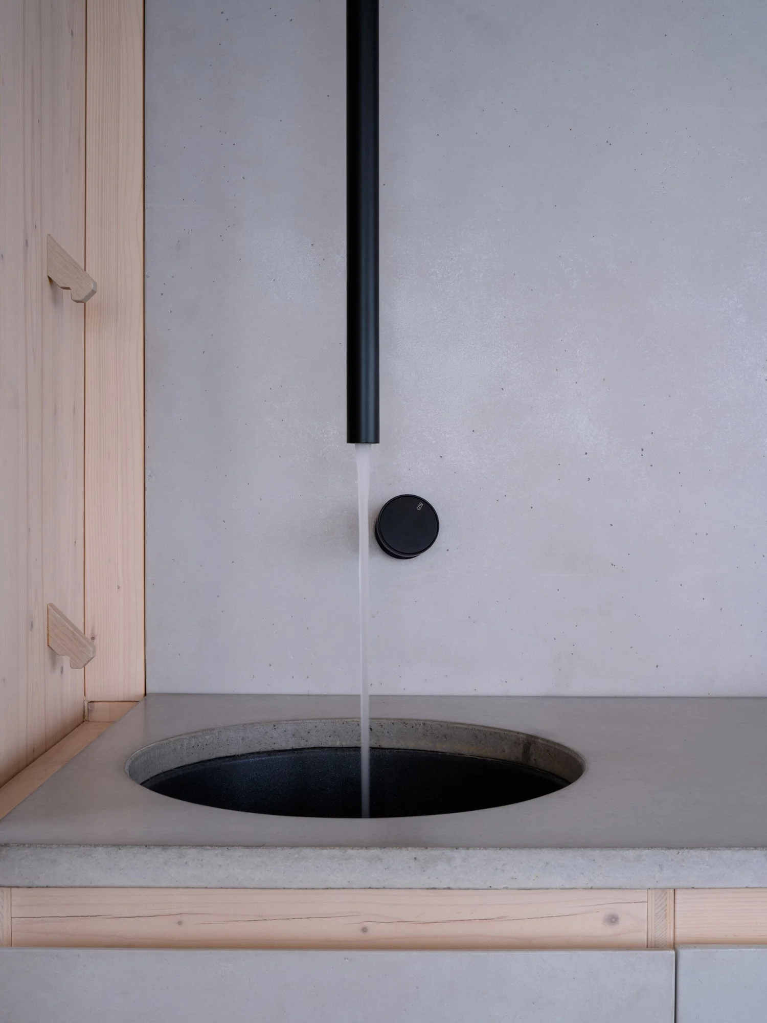 One of the cabin’s most thoughtful gestures appears in the bathroom, where a cast concrete sink is positioned directly within a window frame. The placement transforms an ordinary act such as washing one’s hands into a moment of quiet observation, encouraging occupants to slow down and reconnect with the landscape beyond.