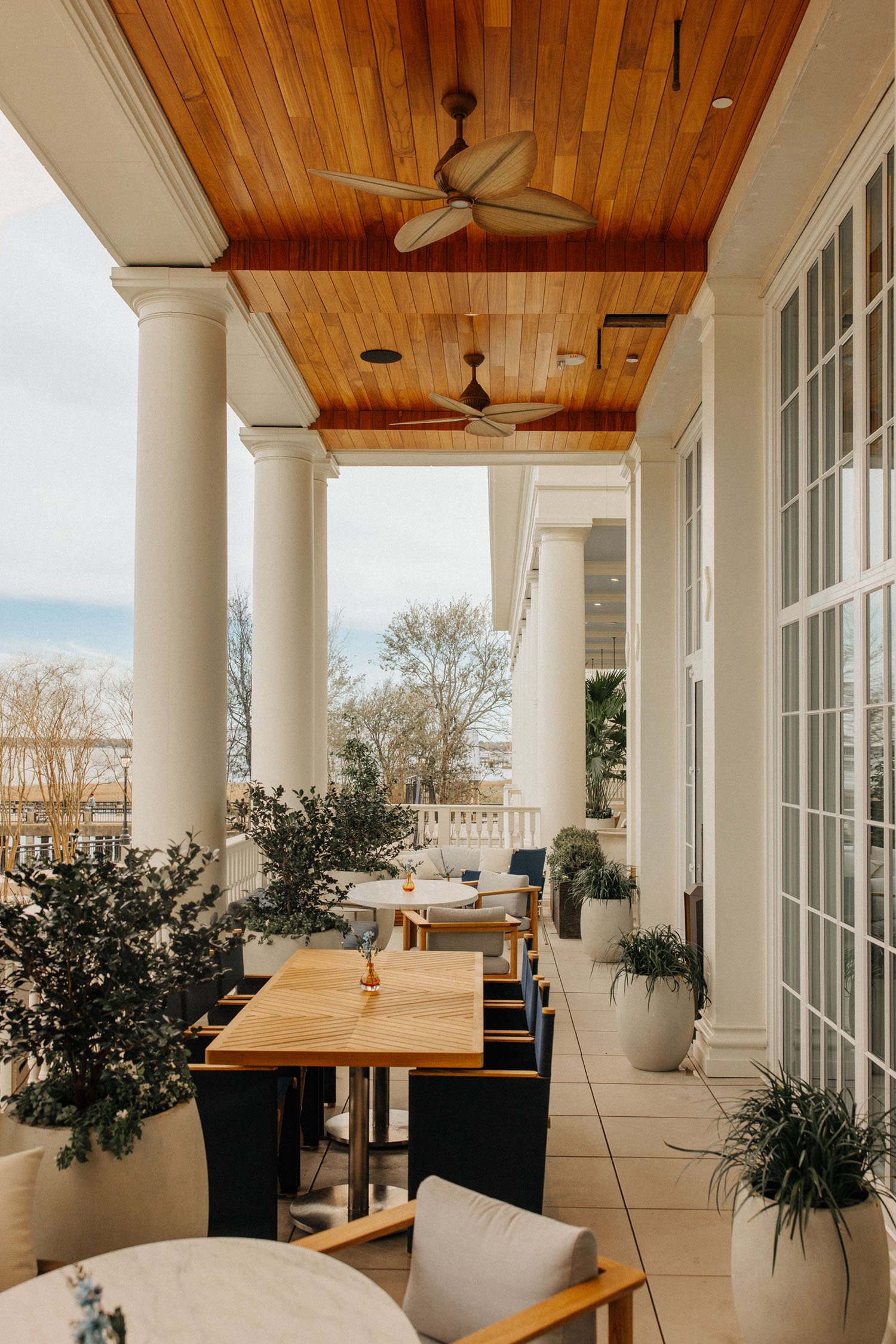 The covered terrace extends the dining room toward the harbor, its teak ceiling and navy seating maintaining the material continuity of the interiors against an open view of the Cooper River.