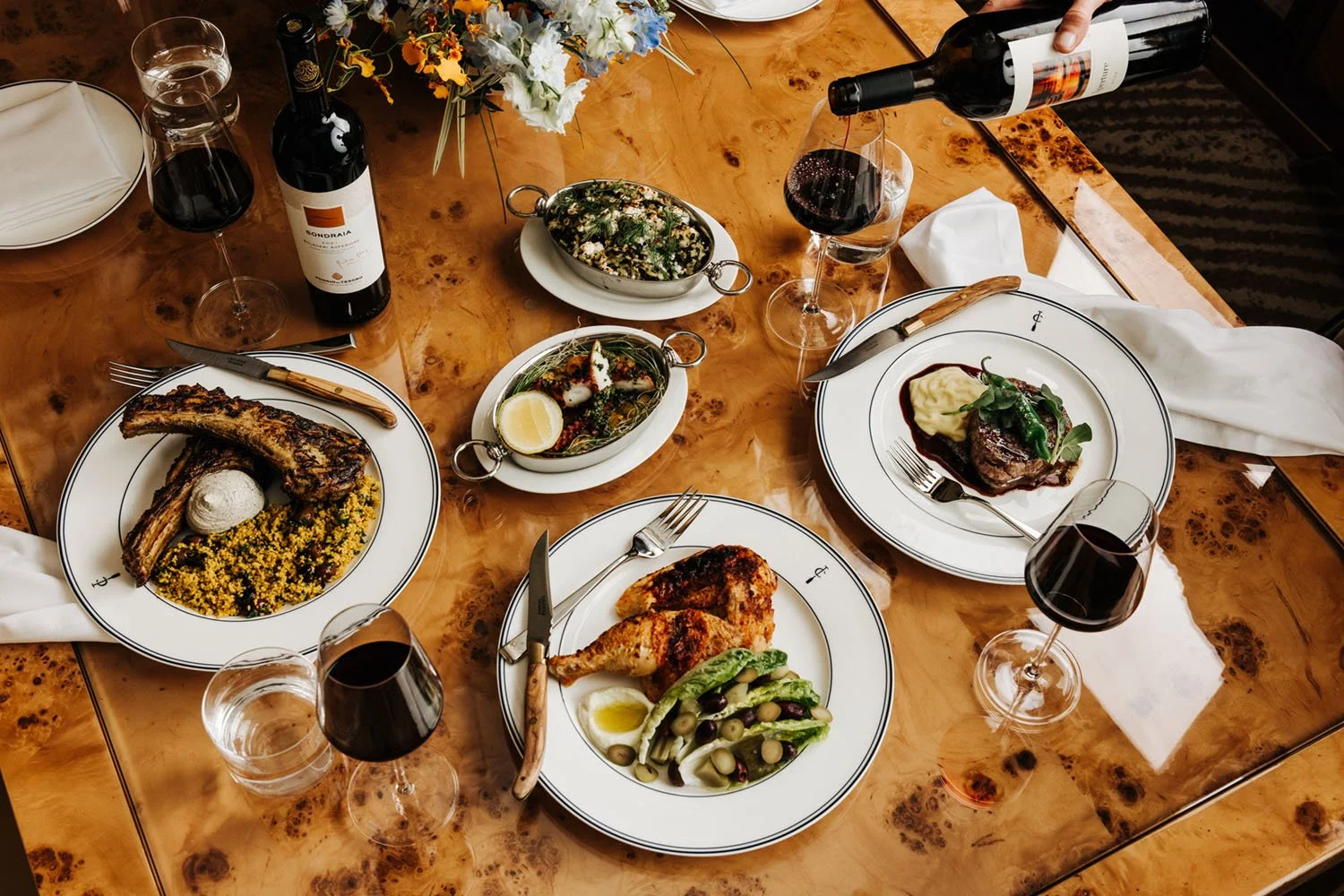 A spread of wood-fired meats, coastal mezze, and poured red wine on the burl wood table captures The Crossing's Mediterranean sensibility rooted in Lowcountry waters.