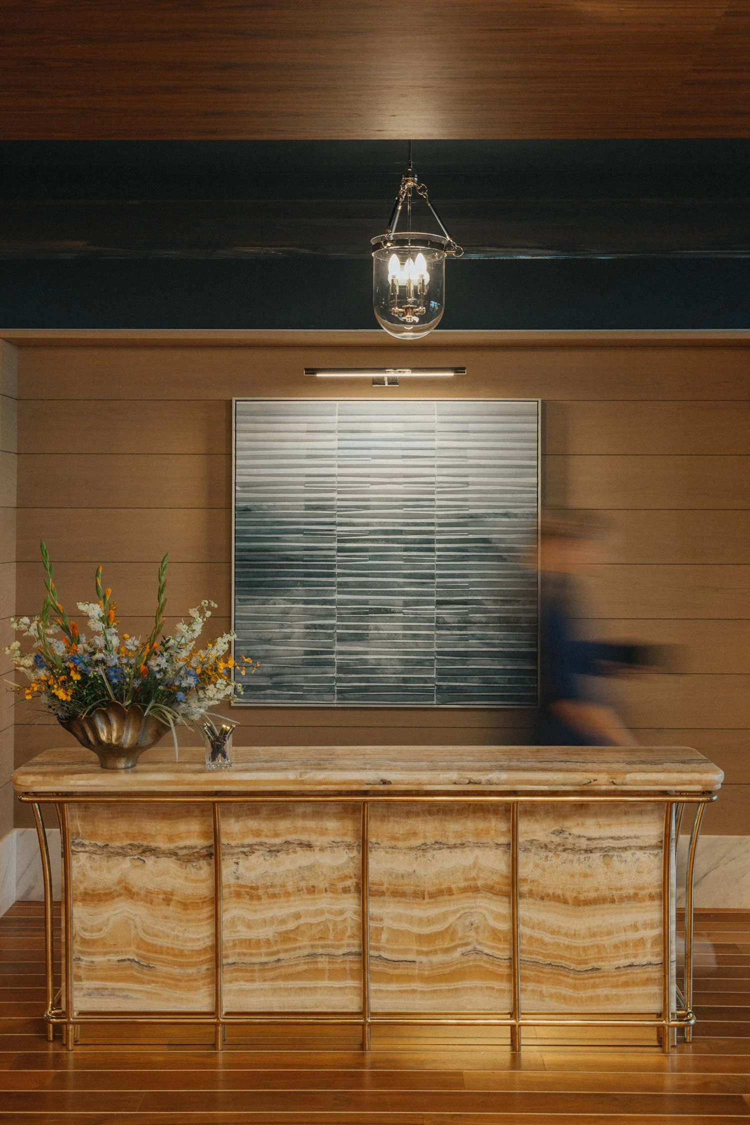 The Honey Onyx host stand anchors the entrance with layered tones of caramel and gray blue that mirror the tidal rhythms of the surrounding marshlands.