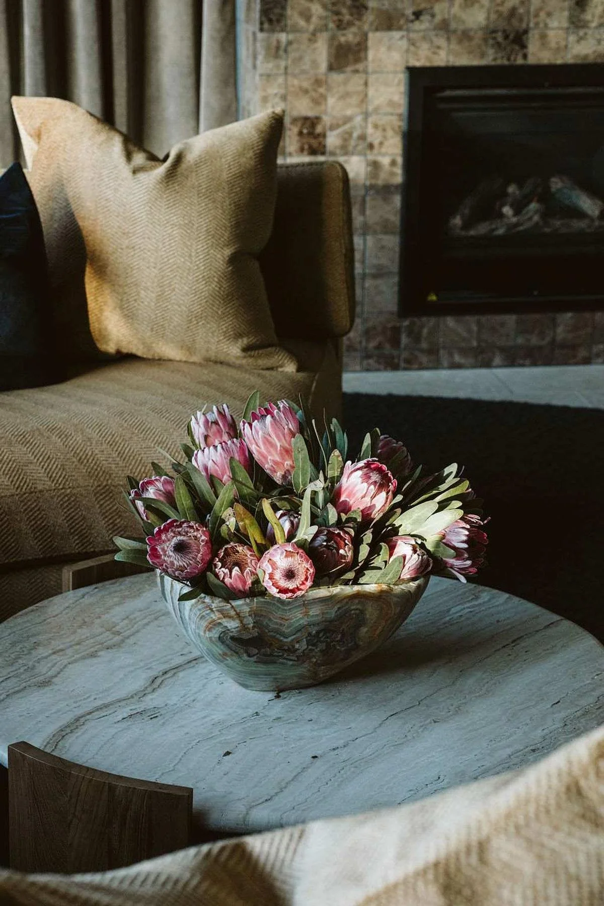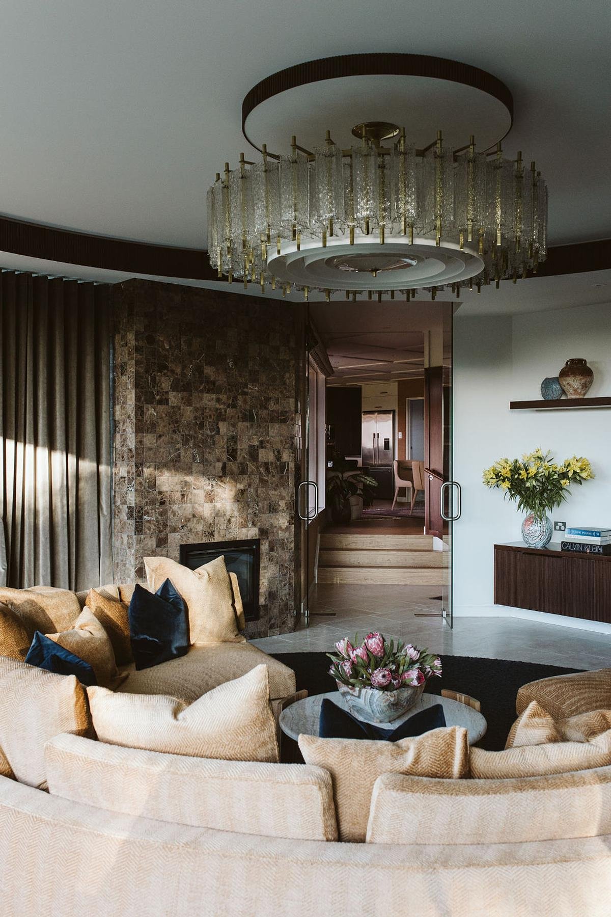 The lower level announces itself with conviction. A circular brass-and-glass chandelier anchors a curved living room where a generous sectional sofa wraps around a travertine-topped coffee table, pink proteas cut from the garden sitting at its centre. The fireplace surround is clad floor-to-ceiling in emperador marble tile, its rich veining catching the afternoon light filtered through floor-length velvet drapes. It is a room designed for evenings; considered, composed, and quietly cinematic.