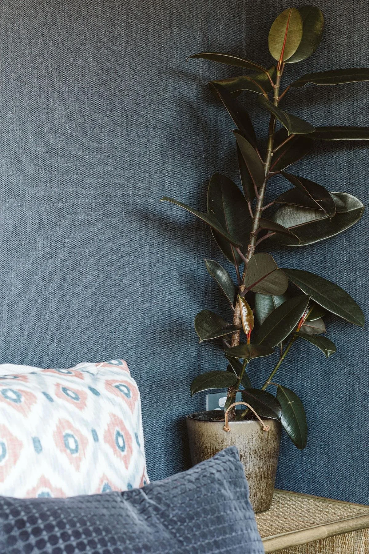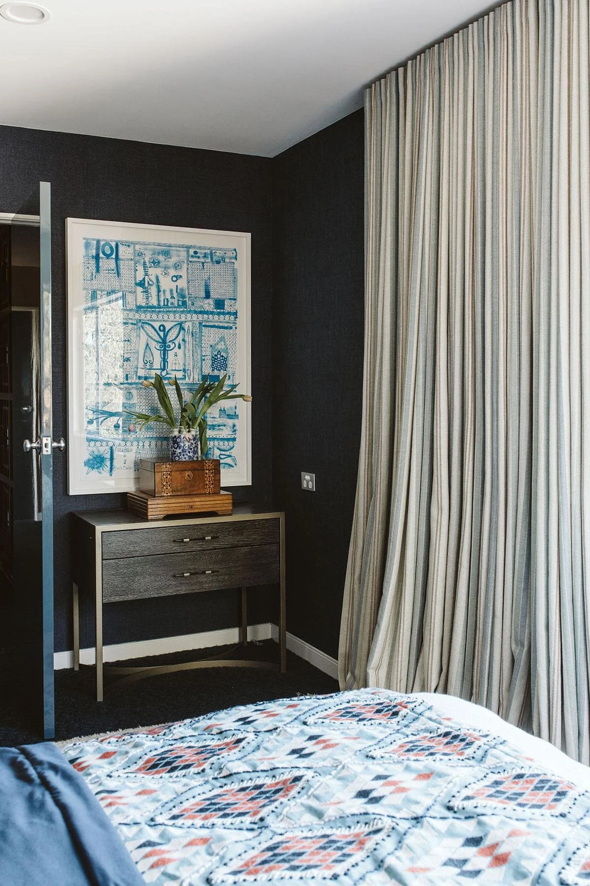 This layering is not accidental. Mansvelt's approach across the 250-square-metre, two-level home rests on the idea that different rooms serve different emotional states. The dark fluted timber joinery of the kitchen, set against Calacatta marble tile, carries the drama of the lower level upward, while the grasscloth-lined stairwell with its warm timber handrail marks the transition between worlds. Even the bedrooms participate in the conversation: one wraps its occupant in deep navy grasscloth, a landscape painting above the bed extending the room's quiet intensity outward toward an imagined horizon.