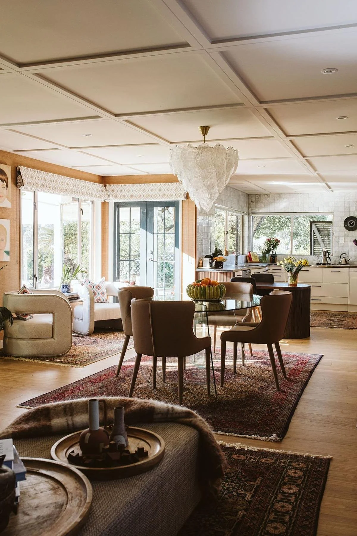 Yet move through the glass-panelled doors, and the register shifts entirely. The open-plan living and dining level above is warmer, more personal. A Murano glass leaf pendant floats above a round dining table set on a worn Persian rug. Grasscloth walls absorb the light rather than reflect it. Graphic ikat cushions, tribal throws, and stacked design books on a solid timber coffee table tell a story of a life collected rather than curated to order. The coffered ceiling anchors the space without formality, and French doors open the room generously to the garden beyond.