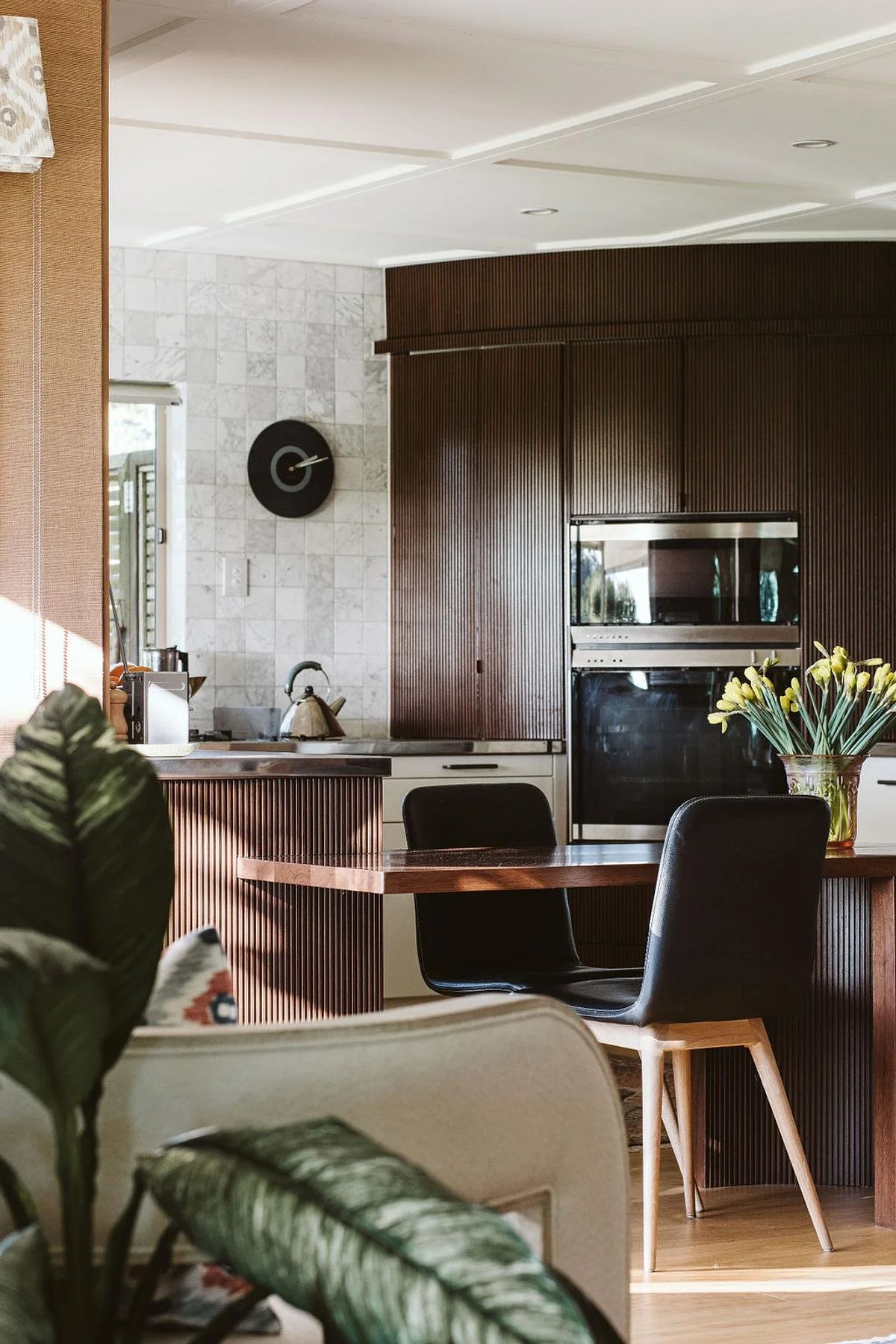 Dark fluted timber cabinetry and Calacatta marble tile give the kitchen a composed intensity that echoes the drama of the level below.