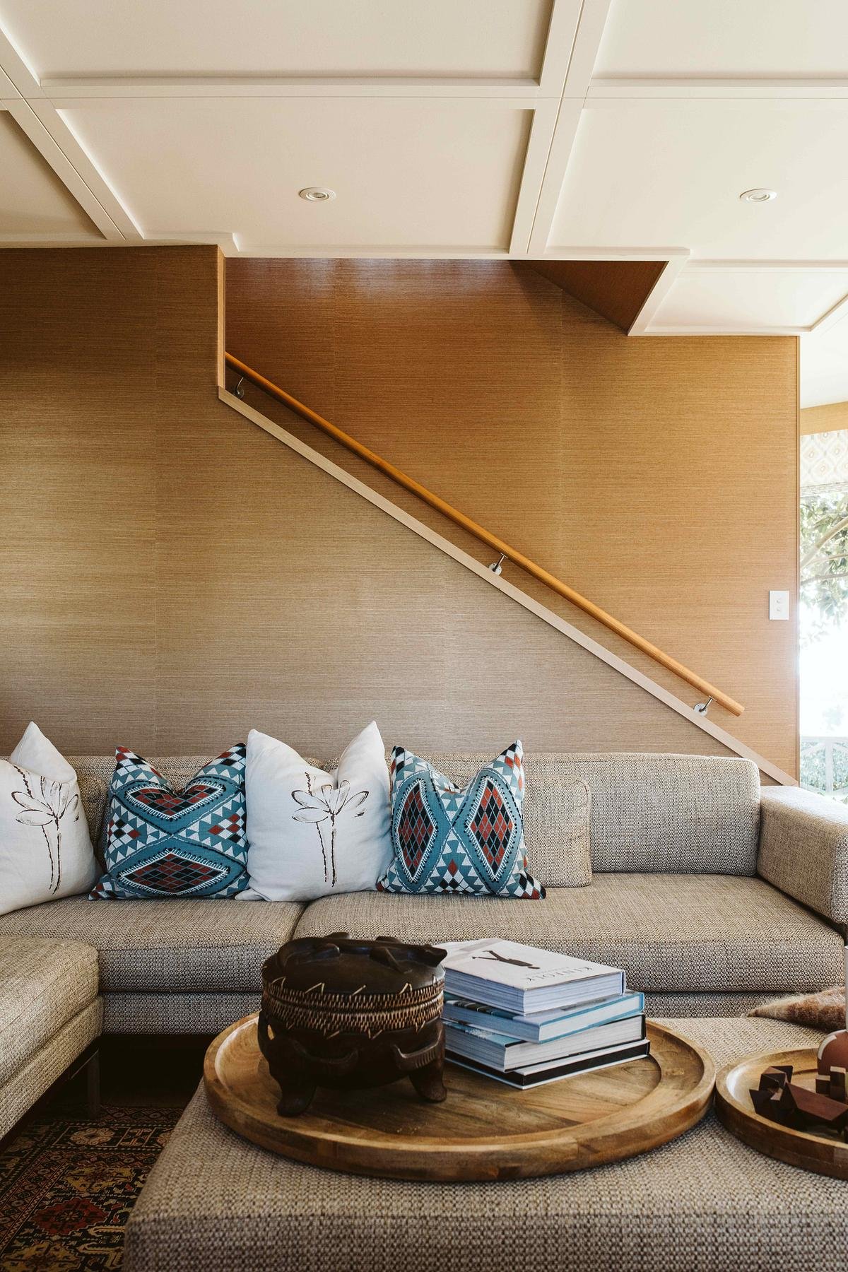Grasscloth walls, a timber handrail, and a low sectional with collected cushions mark the shift from the home's formal register to its warmer, personal one.