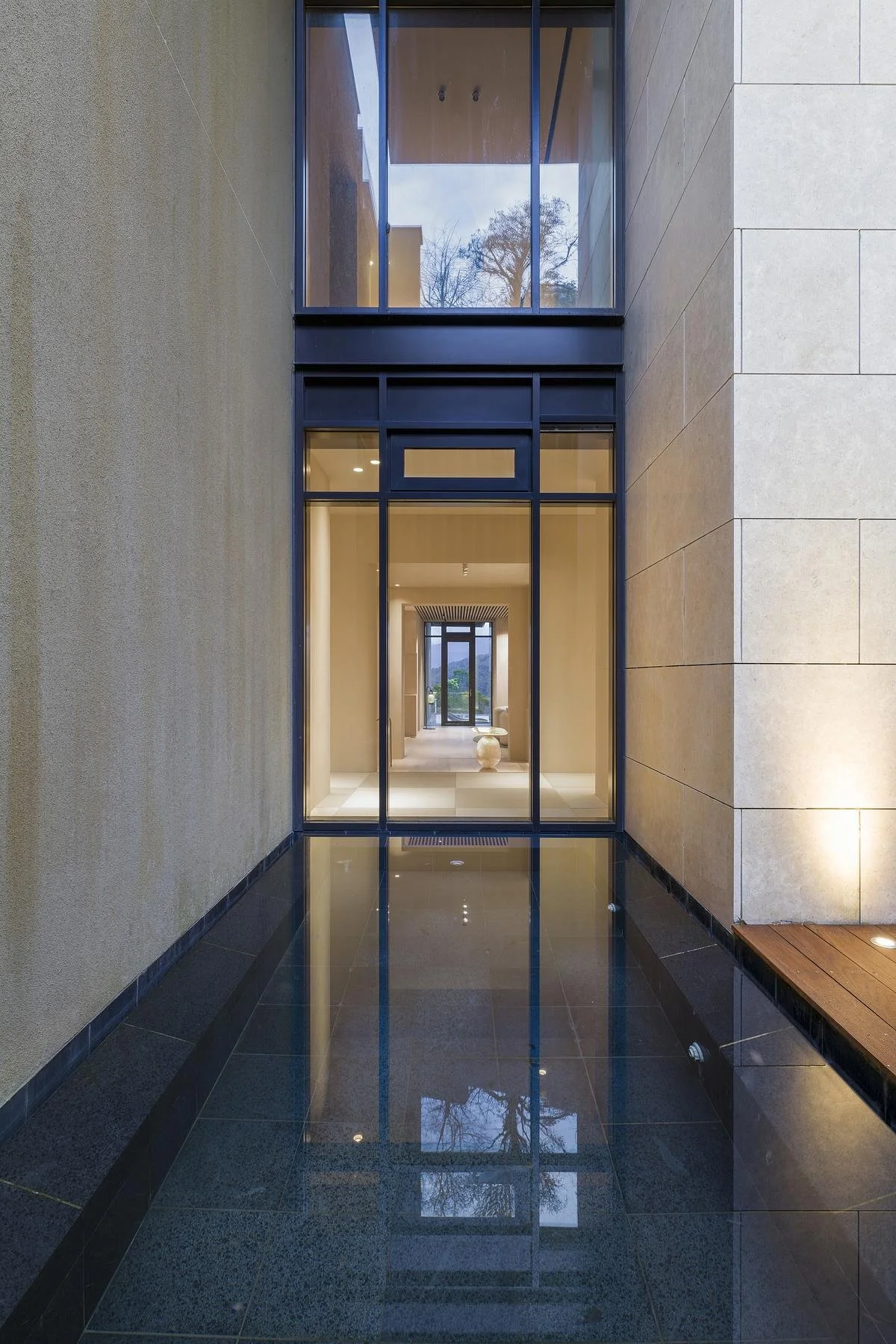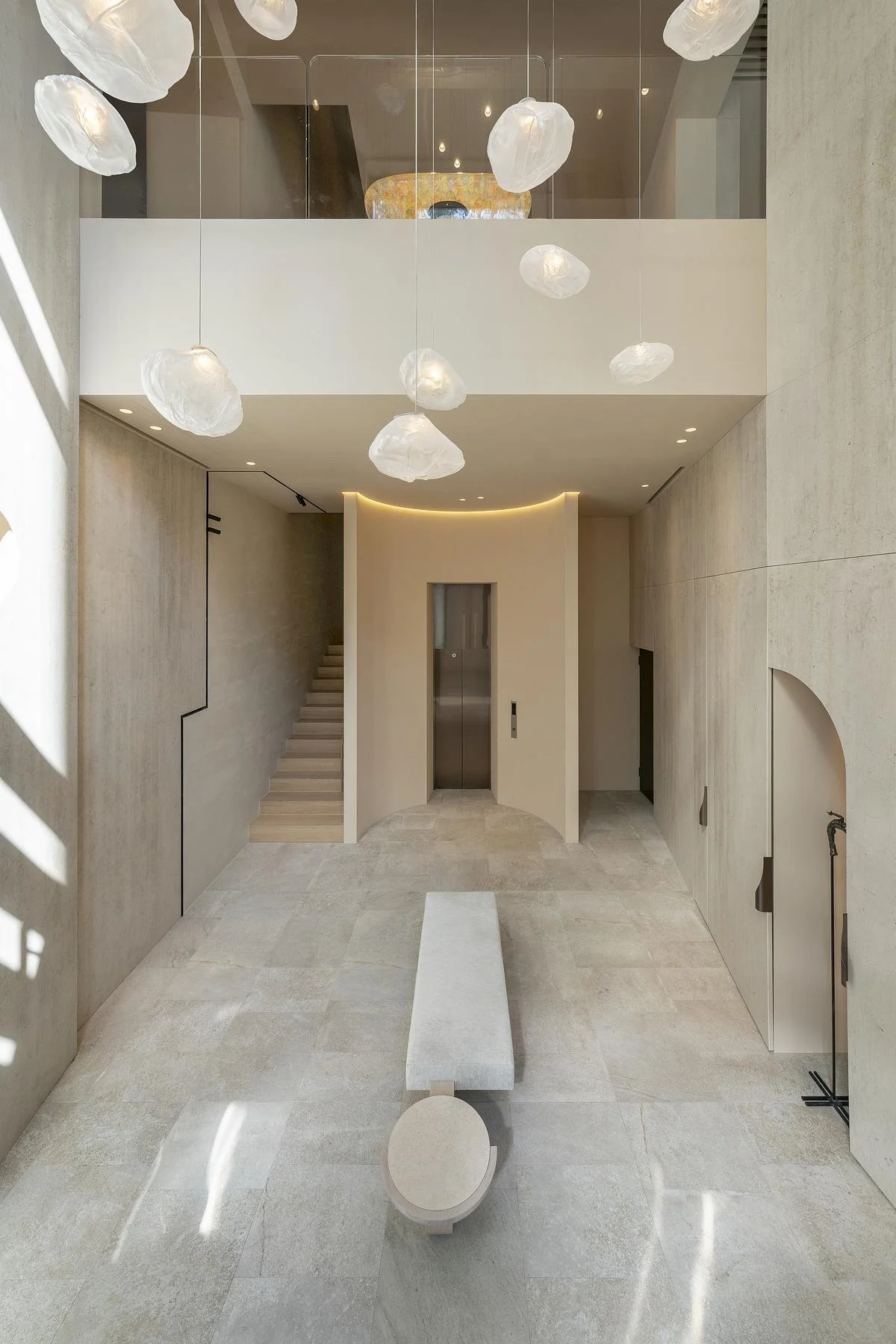 A double-height entry hall clad in pale stone sets the tone for the arrival sequence, with cloud-form pendant lights suspended across two storeys drawing the eye upward before the living band begins.