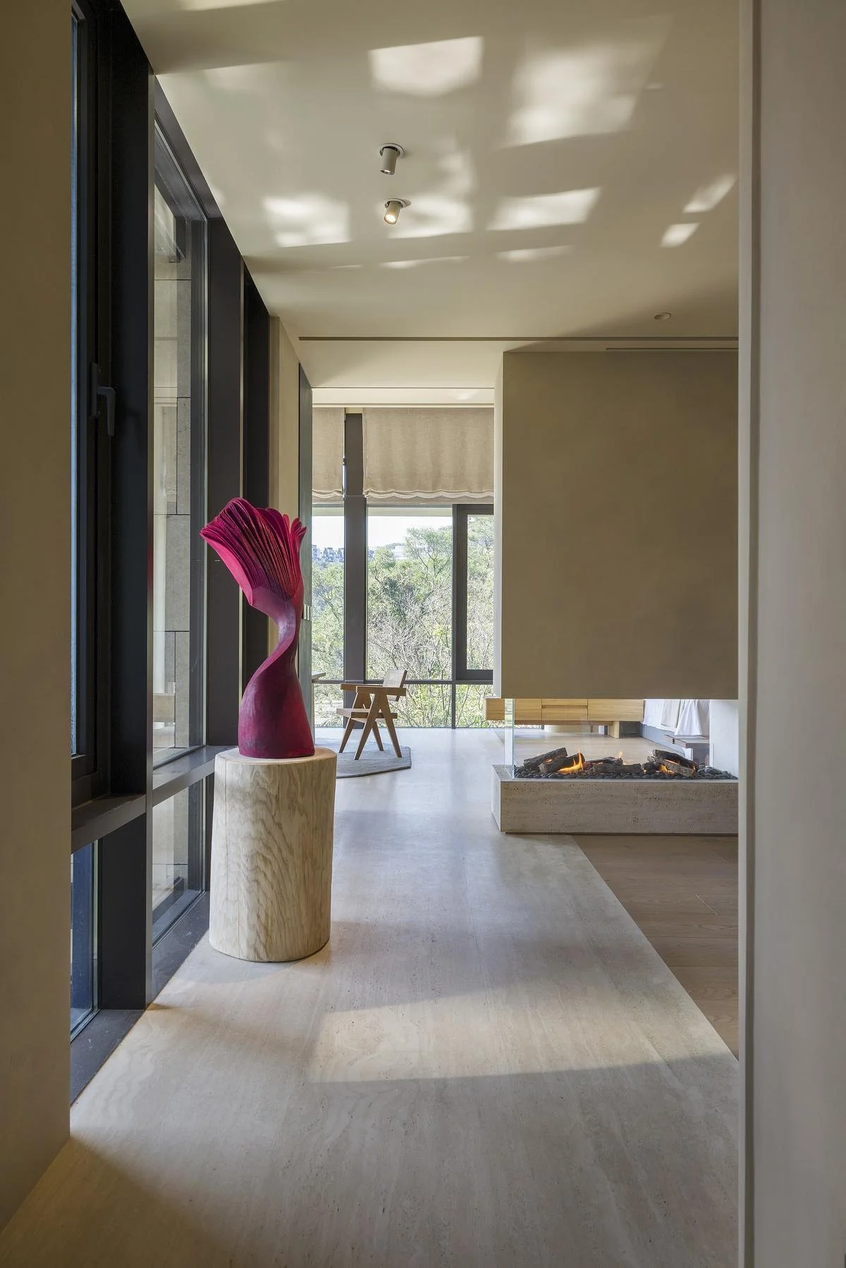 Art and collectible furniture are integrated into the architectural composition rather than applied to it. Pieces anchor key moments within the living band, reinforcing scale and lending the sequence a gallery-like clarity without sacrificing domestic warmth. The envelope remains deliberately restrained so that each selected work can be read on its own terms.