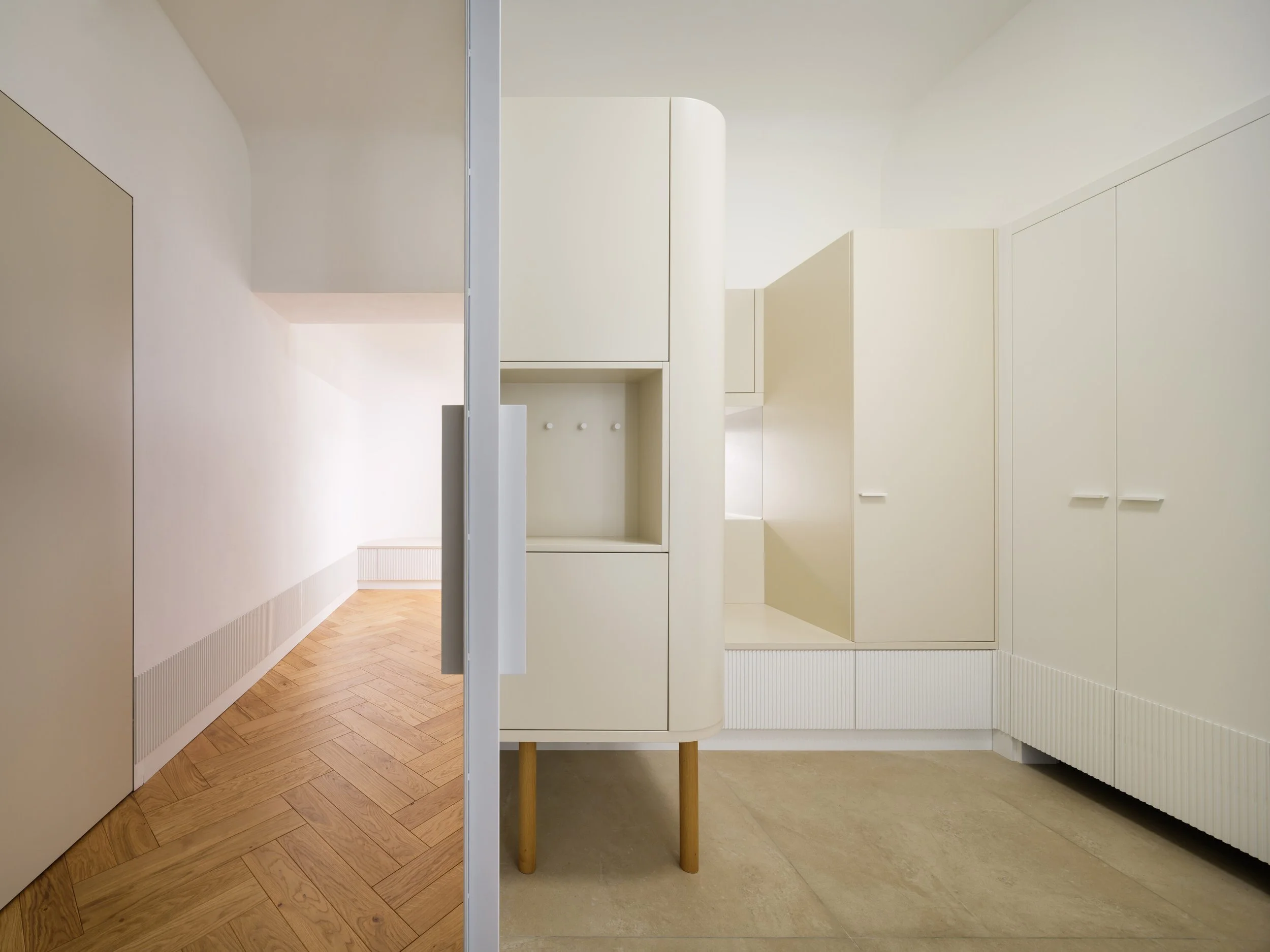 A sculptural hallway connecting the various zones of the home doubles as a storage and seating area, setting the tone for this light-filled apartment.