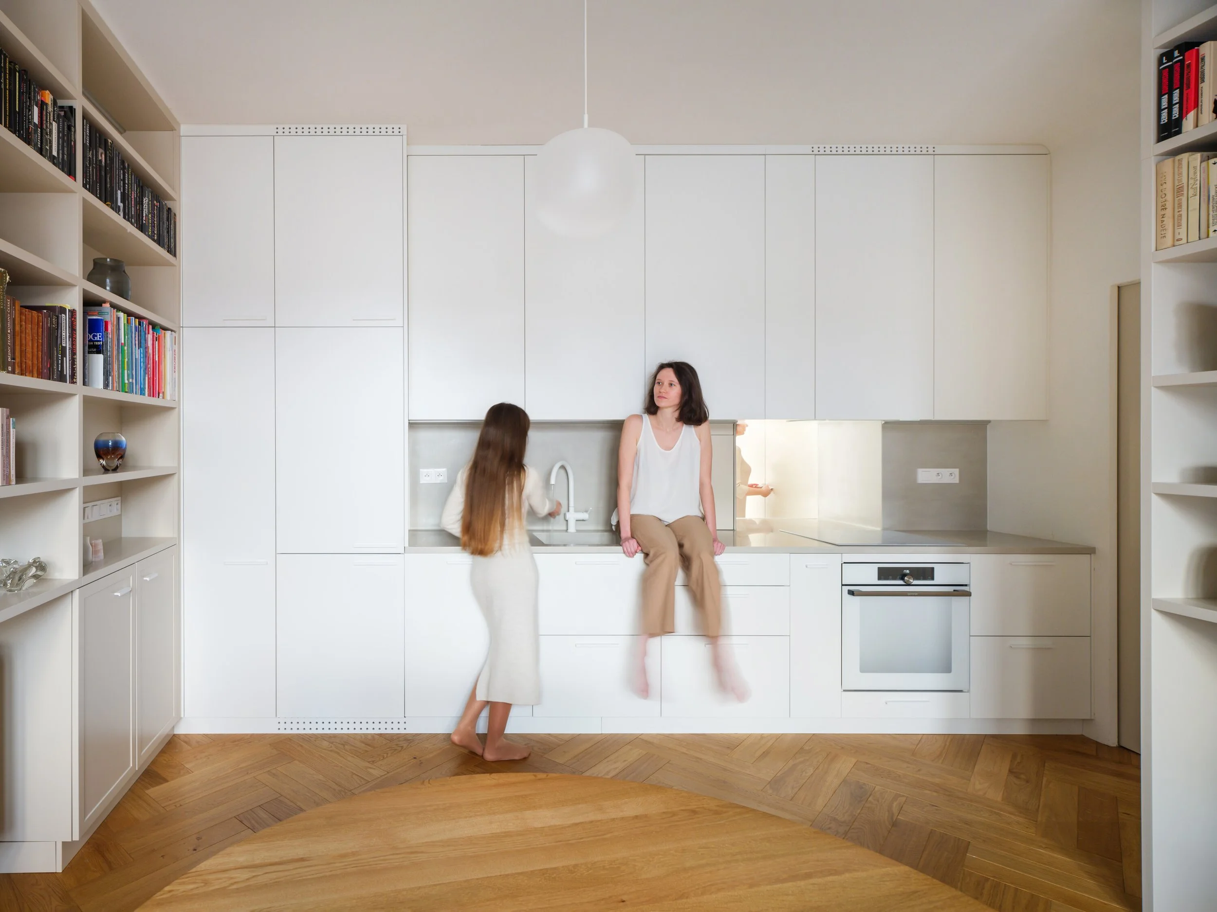 From there, the living zones unfold in a well-choreographed rhythm. A raised platform beneath the living room window invites rest, reading, and conversation, framed by floor-to-ceiling bookshelves that feel both practical and poetic. A generous round dining table anchors the kitchen, which is visually and conceptually open to the rest of the apartment. The window between the kitchen and hall doubles as a playful camera obscura—a reminder that design can be rigorous and joyful.