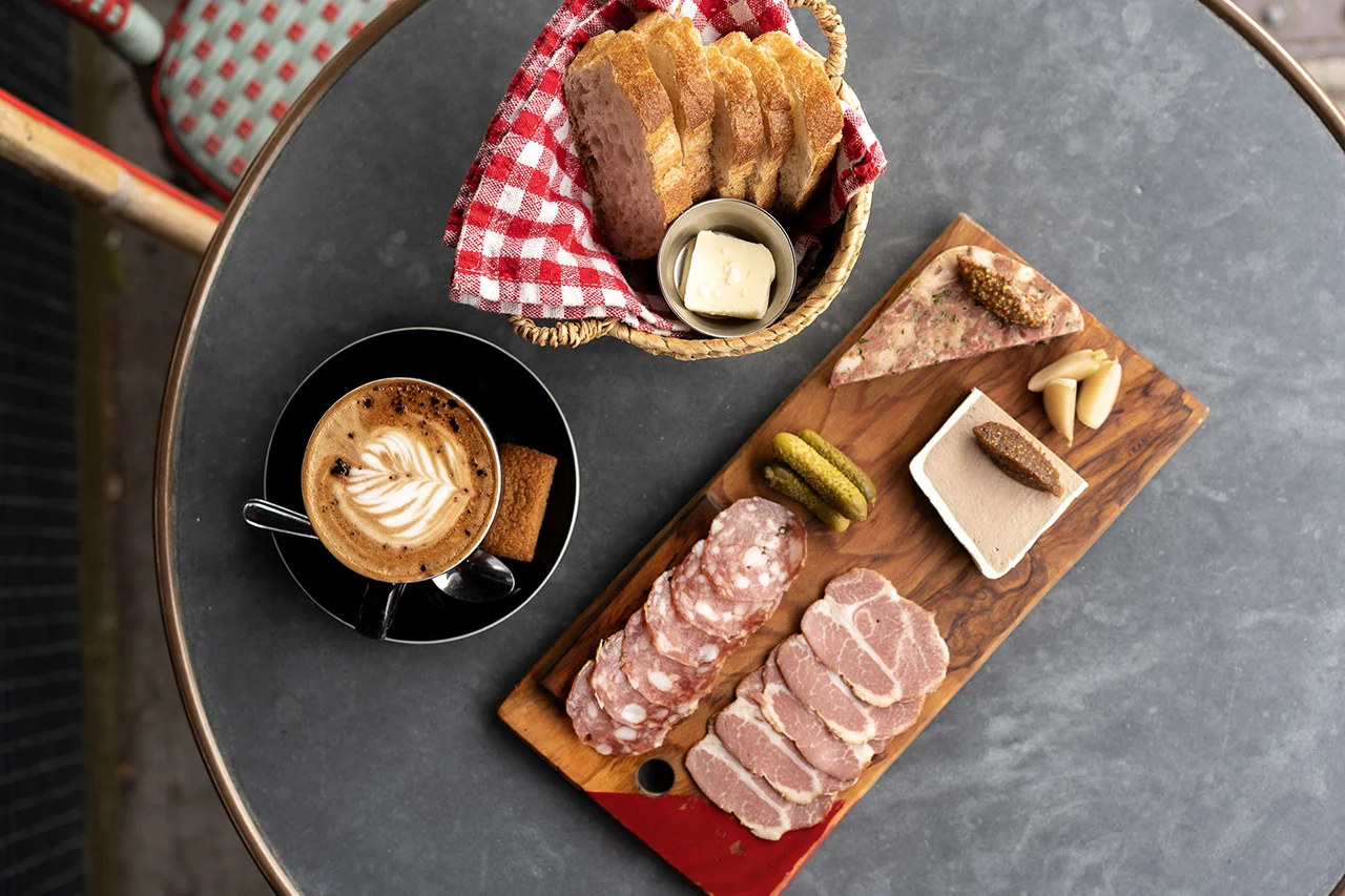Assiette de Charcuterie, house and artisan cured meats and a buttery Cappuccino.