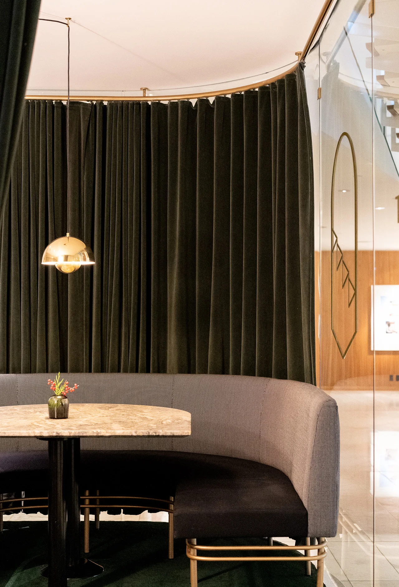 At the entrance to the restaurant, a private room enveloped by forest green velvet drapes and lit by a single light fixture atop the half circle marble top table sets the mood for an intimate yet vibrant dining atmosphere.