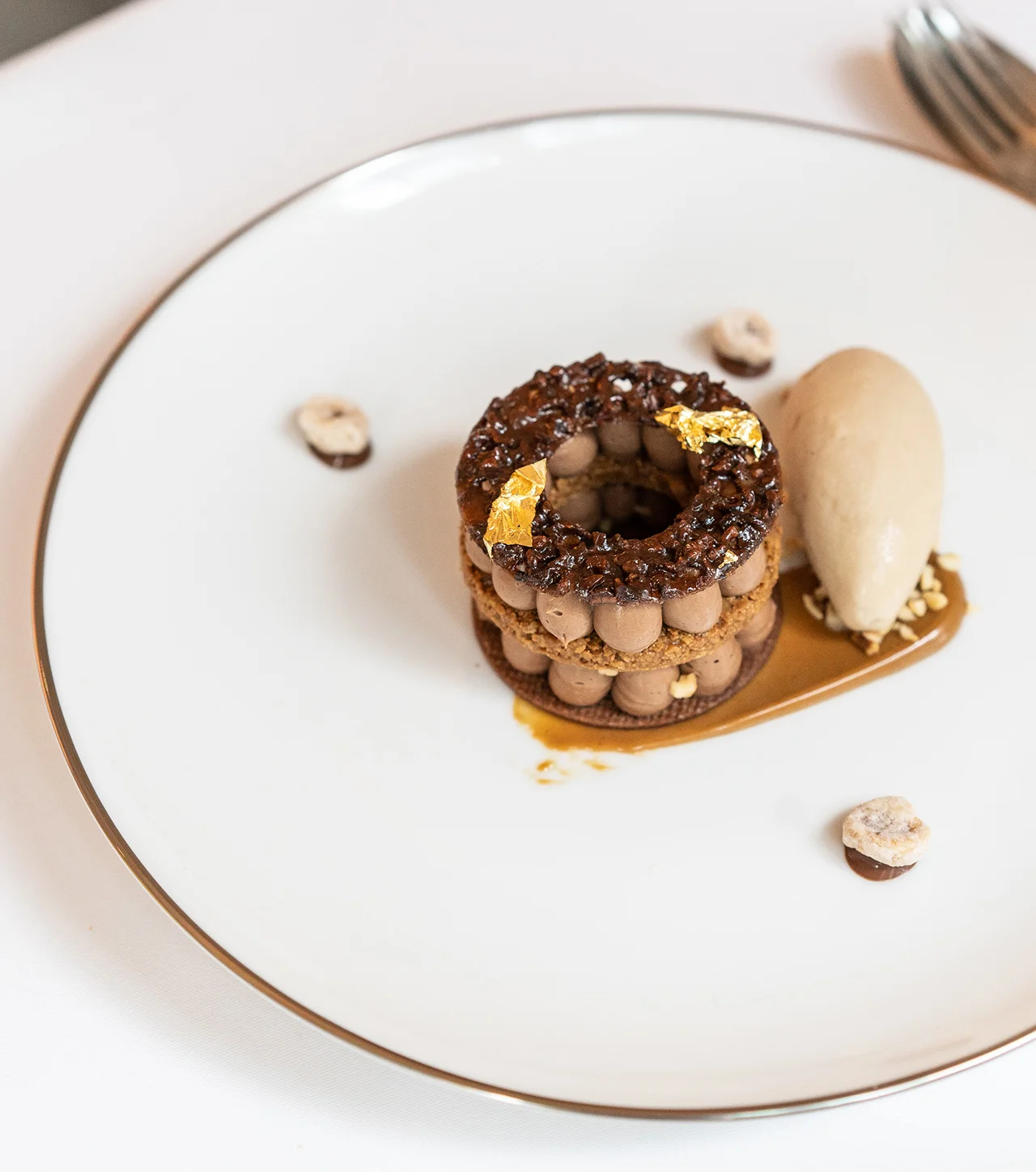 The second is a favourite for chocolate lovers, served with crunchy chocolate ‘rings’ with layers of hazelnut cream topped with gold foil and hazelnut gelato on the side. Blend the various textures for an optimal taste.
