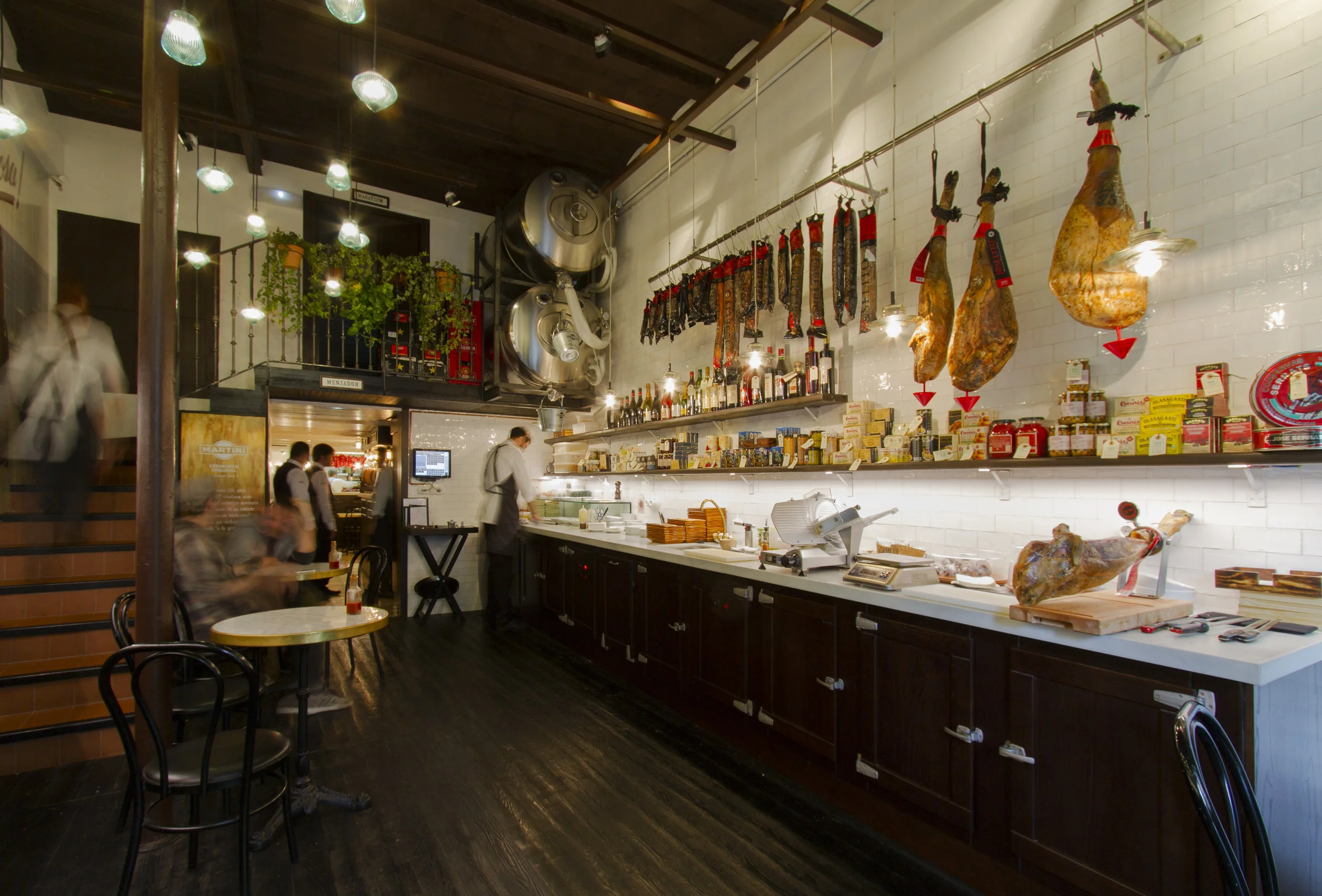 Created by Albert Adrià, younger brother of Ferran, the renowned chef and owner of the legendary El Bull. Continuing the family tradition, Albert has successfully built his own gastronomic empire in Barcelona. All it takes to realise that his success is not fortuitous, is to simply go through Bodega’s green door. The first room looks like an exclusive delicatessen, where a selection of hams and salamis is proudly displayed on the white tile wall, and scrumptious snacks are prepared on the counter. These treats can all be washed down with a delicious glass of vermouth or cava. The second, slightly larger part of the premises is a restaurant where one can spend hours enjoying various specialties. The choice is extensive, with fish, seafood, and a wonderful selection of olives, hams, sardines and many other goodies.