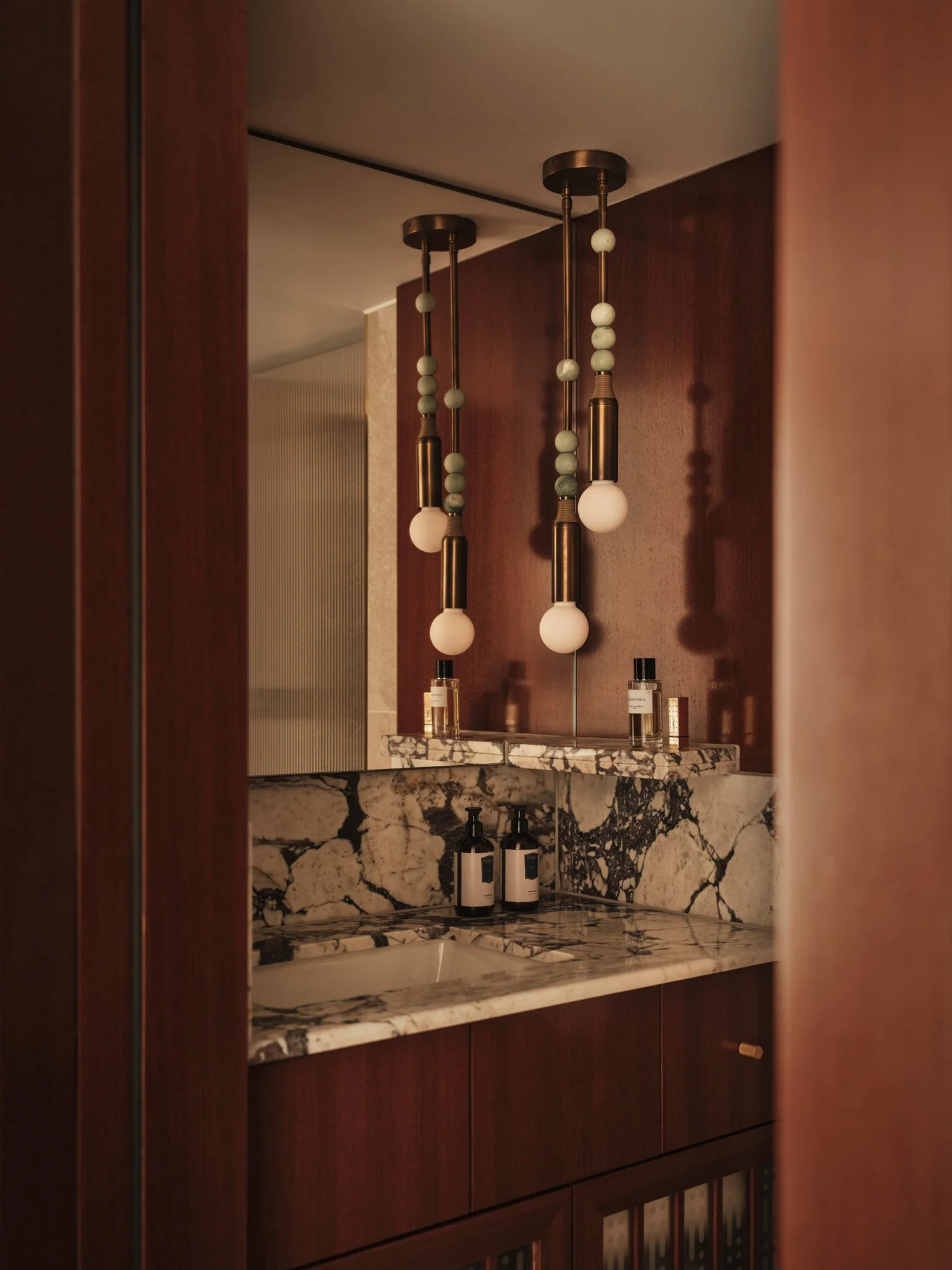 Practicality is handled with the same considered approach. Desks convert into dressing tables, console tables into chessboards. Each room includes a classic banker's lamp and a discreet integrated safe. Bathrooms are finished in marble and stocked with Floris amenities presented in bespoke bottles created exclusively for the hotel, with selected rooms offering baths and separate seating areas.