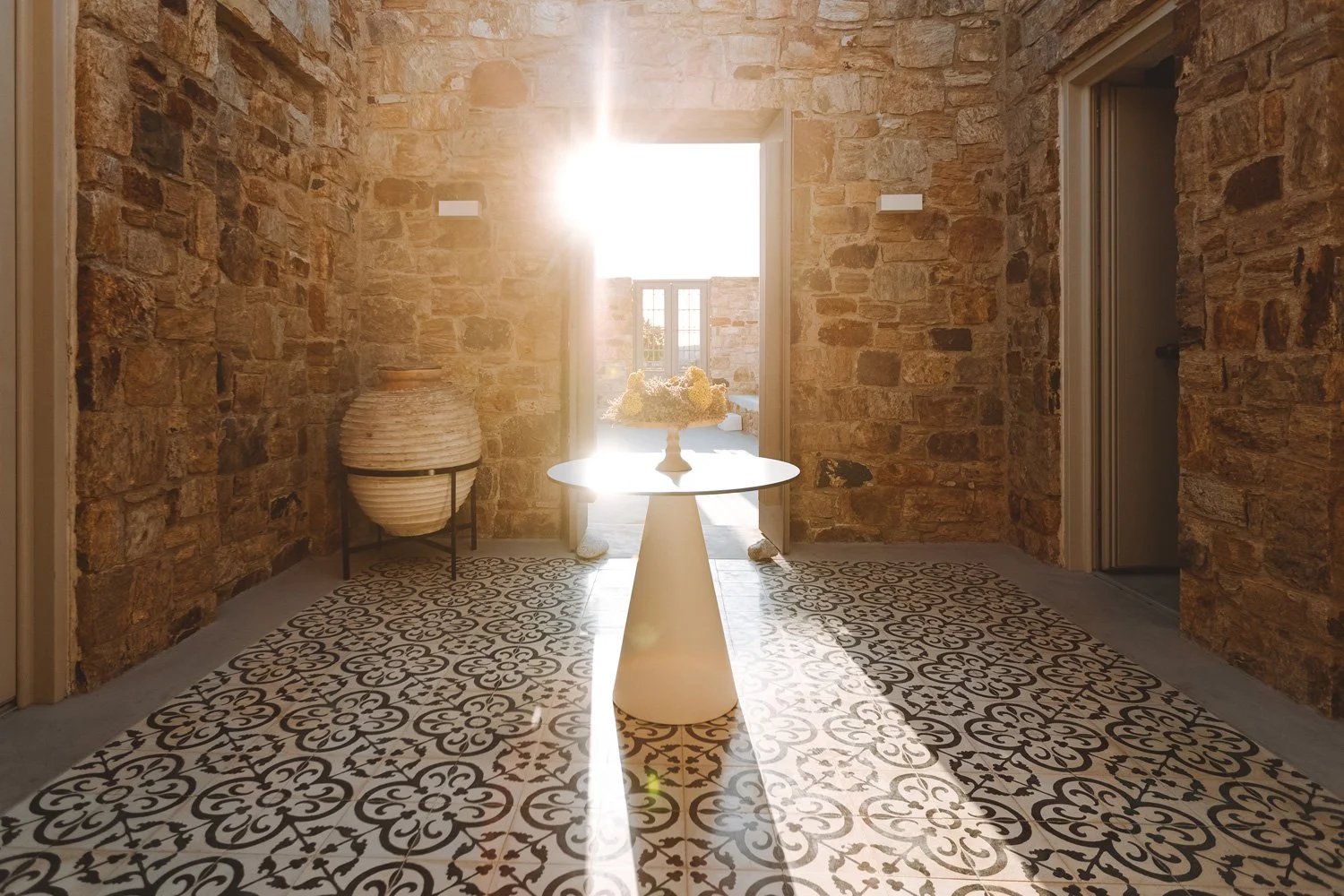 Morning light floods the entrance corridor at Ayiopetra, where patterned cement tiles, a coiled ceramic vessel, and a single floral arrangement distill the property's editorial approach to composition.