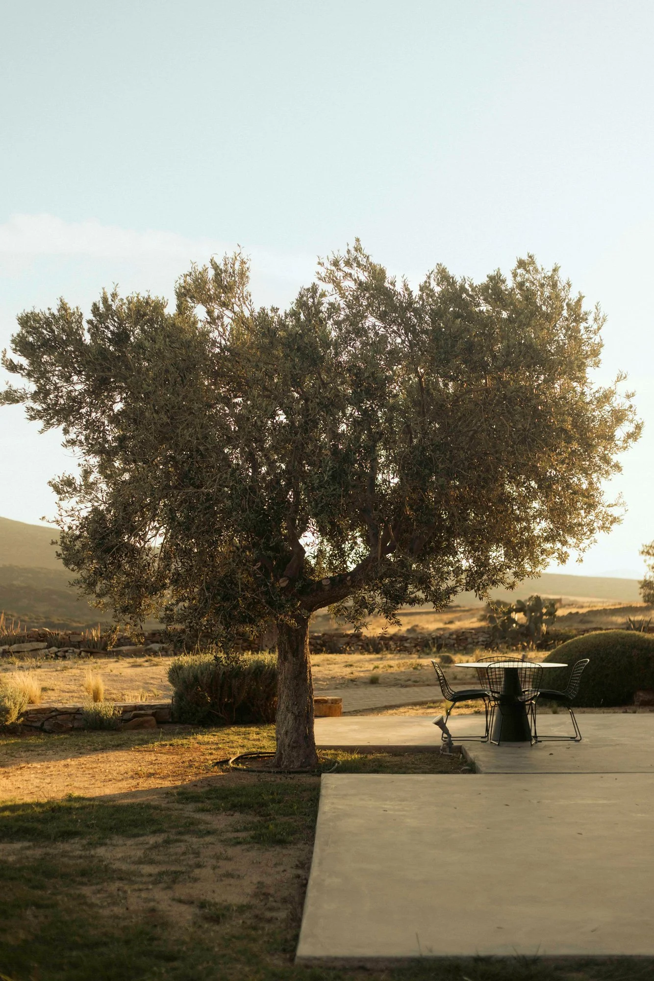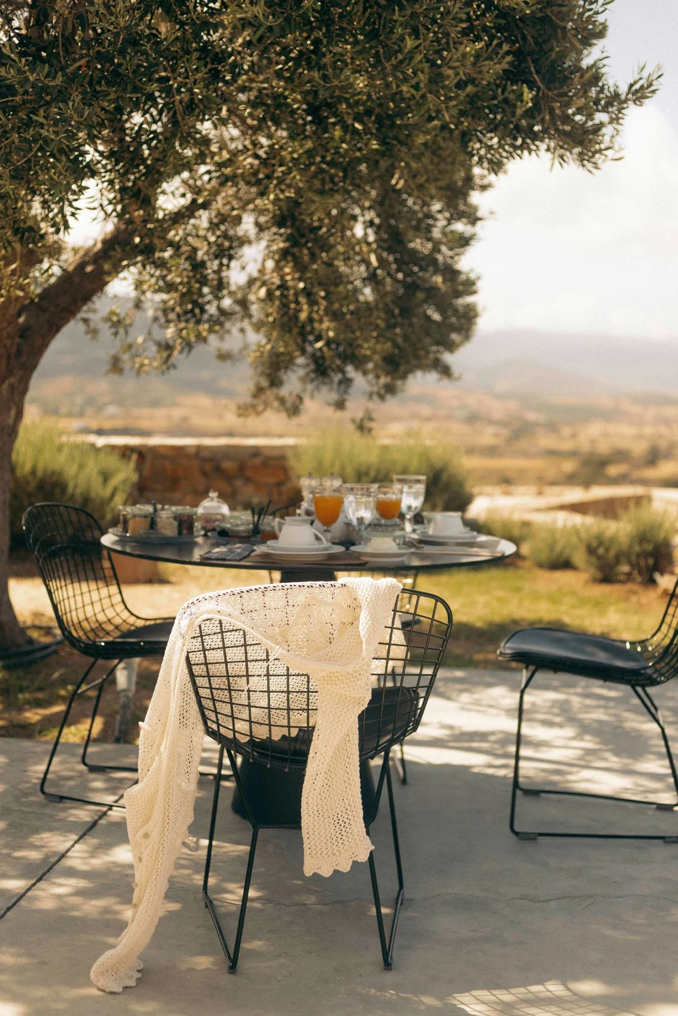 Breakfast unfolds beneath a mature olive tree on Ayiopetra's main terrace, the valley stretching toward the mountains as Naxian produce arrives simply and without ceremony.