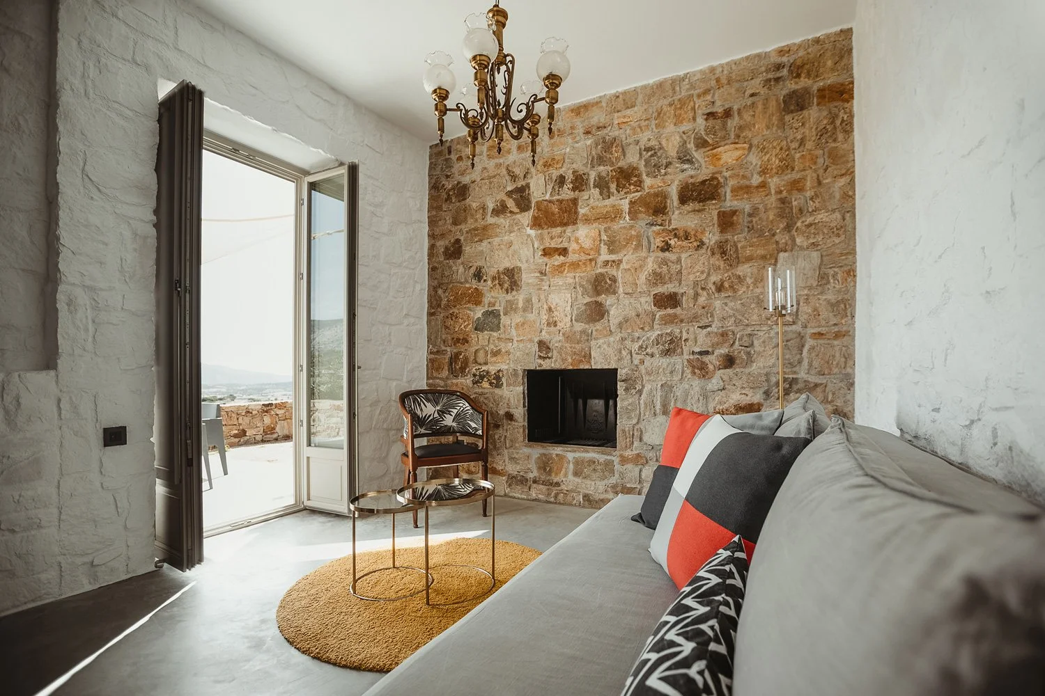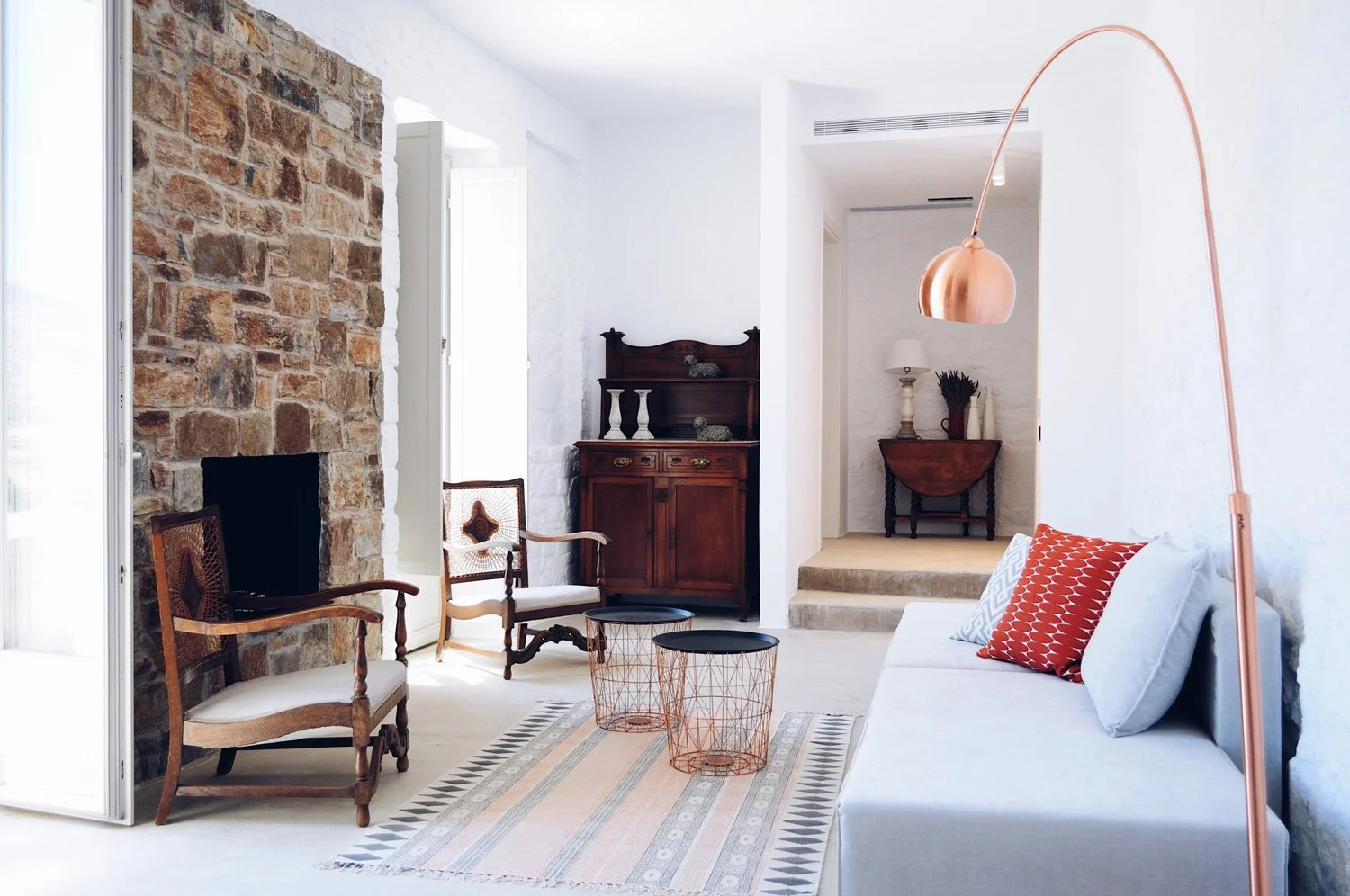 In the Fantastic Four living area, a copper arc lamp and antique Cycladic chairs sit in easy conversation beside an exposed stone fireplace, the mix feeling collected over time rather than sourced for effect.