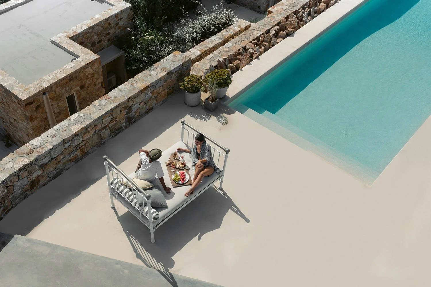 The geometry of stone walls and still water mark the unhurried pace that defines a stay at Ayiopetra.